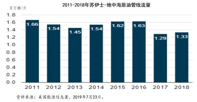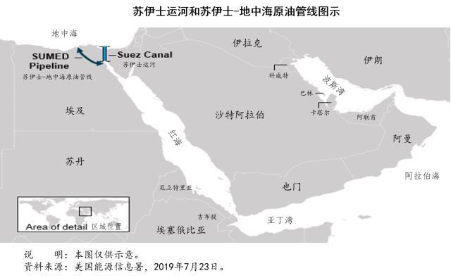 320公里长的在埃及境内的苏伊士-地中海原油管线,将原油从红海输往地中海,两条并行管线的合计最大原油输送能力为280万桶/天。如果苏伊士运河不能通行,苏伊士-地中海原油管线是将原油从红海输往地中海唯一的替代路线。2016年以来,由于苏伊士运河的扩宽和全球原油贸易流向的改变,通过苏伊士-地中海原油管线的原油数量不断下降。