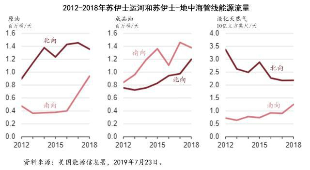 自2016年以来,通过苏伊士运河和苏伊士-地中海原油管线北向的石油数量增长逐渐趋缓,而南向的数量则不断增长。尤为重要的是,苏伊士运河已经成为美国和俄罗斯的原油、成品油输往亚洲和中东南向重要的通道。