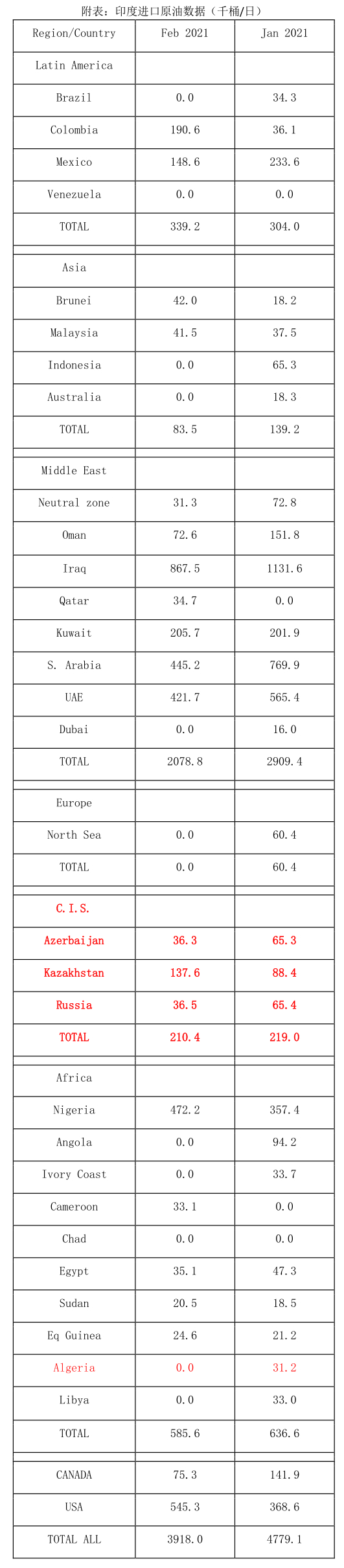 对全球原油的分配影响相对有限。成品油的流通影响相对更大些。如果欧洲供给通道中断,可能更多的是把Brent和迪拜的价差搞大!反正来中国的原油很少从苏伊士通过!地中海去印度的可能有点量。路透新闻对印度1-2月份的进口情况有数据(见附表),其中来自中亚和阿尔及利亚的数量就在20-30万桶/日之间。如果炼厂得不到原油,可能更需要操心的是全球的跨区贸易紊乱!现货市场出现波动。