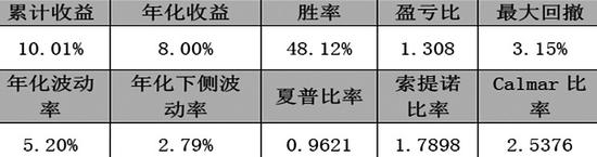 从策略净值来看,在无杠杆的情况,共收获10.01%的总收益,策略绩效如下:
