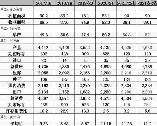 根据农业展望论坛对面积额的预测,若美豆新作单产在取趋势单产50.8蒲的情况下,总体可实现丰产,但这并不构成利空压力,因为旧作库存极低。在假设需求能延续2020年风光的前提下,新作的库存很难有累积。如果单产能达到52蒲,历史上出现过的最高纪录,期末库存也才有2.5亿蒲左右,仍然是一个相对偏低的水平。