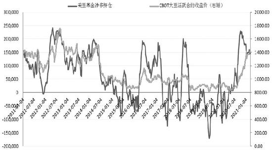 图为美豆基金净多持仓和活跃合约的收盘价对比