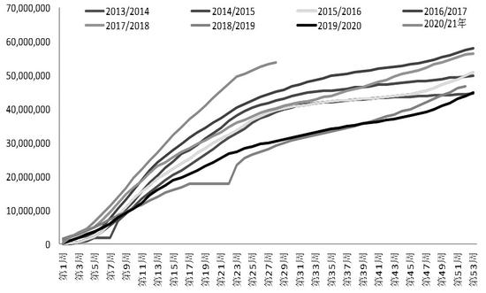 图为美豆旧作累计出口销售
