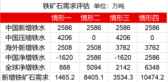 情形一:中国压缩铁水4206万吨,海外新增铁水2508万吨,全球净增铁水888万吨,对应铁矿石需求1465万吨,铁矿石过剩。