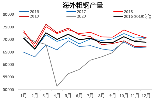 我们从海外的钢铁产能恢复的视角观察,20年第四季度12月,除中以外的海外粗钢产量看,已经追平19年同期水平,高于5年均值171万吨。