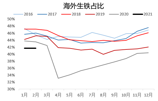 2021年1月,除中国以外,海外高炉生铁和还原生铁产量为4675万吨,跟19年同期产量4739万吨比少64万吨。比5年同期均值4599万吨少76万吨。考虑到中国1月生铁产量比19年增574万吨。