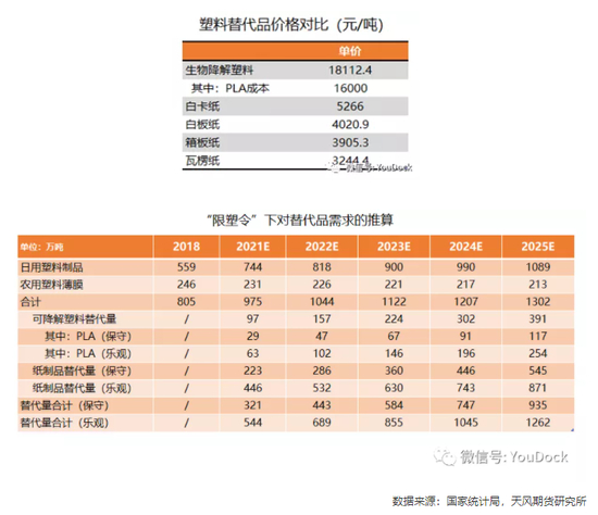 由于塑料制品的使用遭到限制,纸制品、可降解塑料(PLA、PBAT)等可以替代传统塑料制品的材料逐渐走入大众视野。在可降解塑料中,我们主要关注原料为玉米淀粉的PLA聚乳酸材料。当前我国的PLA生产技术相对不成熟,因此PLA的生产成本较高,约为16000元/吨,相对来说纸制品的成本更低,总体集中于3000-5000元/吨,所以,目前纸制品较PLA材质有一定优势。