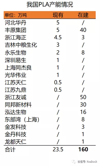 根据前文所述,当前我国PLA生产技术尚未完全成熟,产能较少,约23.5万吨,而根据各公司增产、扩产计划,预计到2023年底,我国将新增聚乳酸产能约160万吨,满产情况下可生产PLA约183.5万吨,可完全覆盖我们预估的新增需求量。