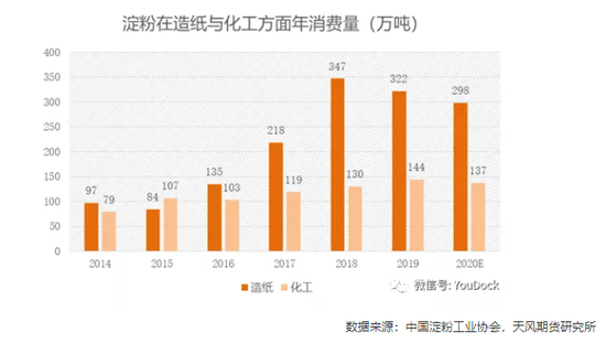 在淀粉年消费量上,自2018年以来,造纸需求逐年下降,降幅约7%,化工需求相对稳定,集中于130-140万吨之间。预计从2021年起,塑料使用的限制大幅增加了纸制品及可降解材料的需求,淀粉在造纸及化工消费上将有所上升。