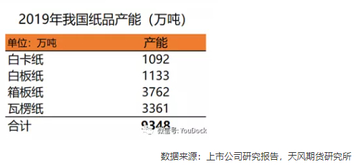 另外,我国造纸行业处于相对产能过剩状态,从2019年的数据看,全国仅白卡纸、白板纸、箱板纸及瓦楞纸四种纸品产能就9348万吨,也可完全满足新增需求的供给。