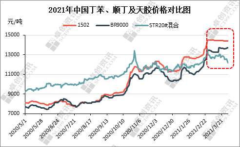 2021年一季度,合成橡胶价格整体上行,而天然橡胶价格快速冲高后震荡下行。以1502、BR9000与STR20#为例,一季度1502均价13327元/吨,同比上涨31%;BR9000均价12210元/吨,同比上涨21%;STR20#均价12327元/吨,同比上涨14%;天胶价格涨幅明显小于合成胶。