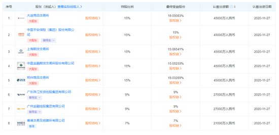 ①2021年2月5日,广州期货交易所筹备组立即着手工商登记工作,其股东结构的“面纱”也随之揭开。根据工商登记信息,广期所正式落户广州市南沙区,注册资本金30亿元人民币,股东包括上海期货交易所(股比15%)、郑州商品交易所(股比15%)、大连商品交易所(股比15%)、中国金融期货交易所股份有限公司(股比15%)、中国平安保险(集团)股份有限公司(股比15%)、广东珠江投资控股集团有限公司(股比9%)、广州金融控股集团有限公司(股比9%)、香港交易及结算所有限公司(股比7%)。