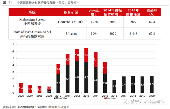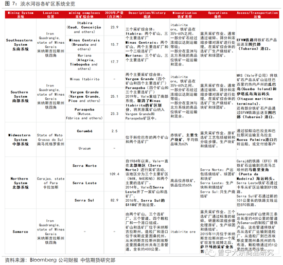 Minas Centrais:目前可经济开采的储量为15.5亿吨,主要在产矿山是Bructu,其年产能约为3000万吨/年,是东南部系统最大的矿山。Agua Limpa矿山在2017年已经枯竭,Apolo项目仍在开发中。另外还有Morro Agudo矿山,其在2019年财报矿山储量部分中首次披露。
