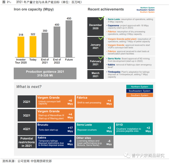根据前文的梳理,在2021年将提产的矿区包括:南部系统的Vargem Grande(增加1000万吨/年)、Paraopeba矿区的Fábrica(增加400万吨/年);东南部系统Mariana矿区的Timbopeba矿山(增加400万吨/年);北部系统的Serra Leste(增加200万吨/年)和S11D(增加200万吨/年)。