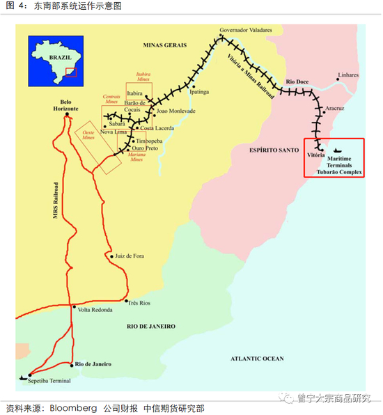 东南系统矿位于米纳斯吉拉斯州的铁四角地区,分为三个采矿综合体:伊塔比拉(Itabira)(由两个矿区和两个主要选矿厂组成)、米纳斯中心(Minas Centrais)(由三个矿和三个主要选矿厂和一个二级选矿厂组成)和马里亚纳(Mariana)(由三个矿区和四个主要选矿厂组成)。