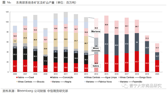 2006年至2018年东南部系统的总产量基本维持1亿-1.2亿/年的水平波动,但在2019年1月25日南部系统Córrego do Feijão矿区的尾矿坝发生了严重的溃坝事故,之后巴西政府加强了对尾矿坝安全性的监管,通过撤销许可证以及法院命令的方式使得VALE部分矿区停产,VALE自身也通过一系列措施(Decharacterization of upstream dams)主动自愿的暂停业务以提高尾矿坝的安全性,最终直接或间接地导致了东南部系统连续两年大幅减产,2018年产量为1.04亿吨,2019年产量降至7310万吨,2020年产量降至5730万吨。