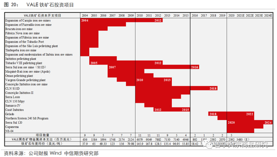 我们具体梳理了2004年以来VALE铁矿石业务主要的投资项目,项目最多的时间段即2010-2012年,这三年时间里是VALE铁矿石投资项目最多,投资金额最高,而矿价也保持在120美元/吨以上的高位。