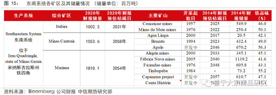 Itabira:东南部系统中最早开始运营的矿区,目前可经济开采的储量为10亿吨左右,主要生产矿山有两座,分别为Conceicao矿山和Caue矿山,目前Itabira矿区总产能在4000万吨左右。