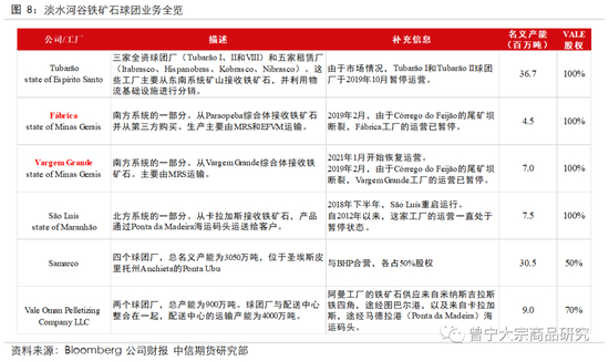 VALE在巴西和阿曼直接或通过合资企业生产铁矿石球团,总名义产能估计为6470万吨/年(包括阿曼的球团厂的全部产能,不包括合资企业Samarco和中国Anyang)。
