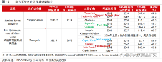 南部系统综合矿区及其矿山的详细信息如图13所示,文字不再赘述,但需要说明的是Galinheiro和Sapecado矿山的铁矿石是送往Pico plant加工的,产销报告中Pico的产量就是Galinheiro和Sapecado矿山的产量,同理Capao Xavier矿山=Mutuca plant,Segredo和Joao Pereira矿山=Fábrica plant,Tamanduá和Capitao=Vargem Grande plant的产量。