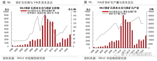 2010年至2015年是VALE黑色金属矿物业务(铁矿及铁合金)资本支出密集期,而这期间铁矿石价格也保持高位(2011年达到顶峰,2014-2015年下行)。资本支出的增加领先于铁矿石产量的增产,前期密集的资本支出体现在2015年后的逐年提产。