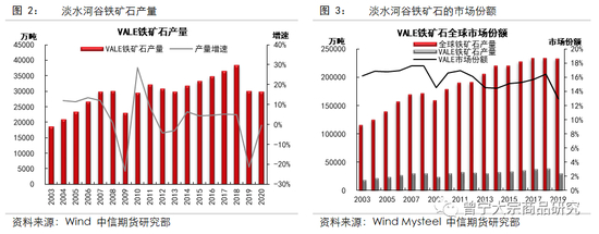 VALE的铁矿石产量在2018年达到3.85亿吨的峰值,占据当年全球铁矿石市场份额的16.4%,但在2019年1月25日,巴西米纳斯吉拉斯州一座属于淡水河谷公司的铁矿尾矿坝发生溃坝事故,使其铁矿石生产运营受到重创,全年铁矿石产量同比减少21.5%至3.02亿吨。