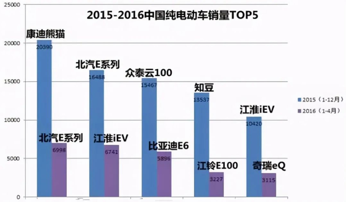 2015年和2016年,中国纯电动汽车销冠分别是吉利康迪熊猫和北汽E系列,对比2015、2016和2020年的新能源车销量Top5,格局发生了巨大的变化。