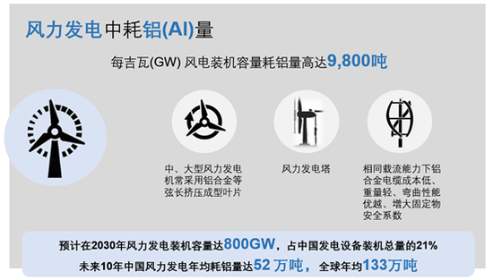 综上,预计在2030年风力发电装机容量达800GW,占中国发电设备装机总量的21%。未来10年中国风力发电年均耗铝量达52 万吨,全球风力发电年均耗铝量达133万吨。