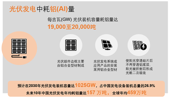 综上,预计在2030年光伏发电装机容量达1025GW,占中国发电设备装机总量的26.9%。未来10年中国光伏发电年均耗铝量达157 万吨,全球光伏发电年均耗铝量达459万吨。