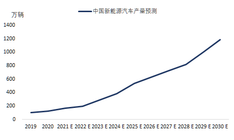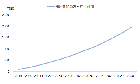 海外新能源汽车也进入加速阶段,我们预计中国外新能源汽车产量将在2025/2030年从2020年的185万辆分别达到860万辆和2000万辆。