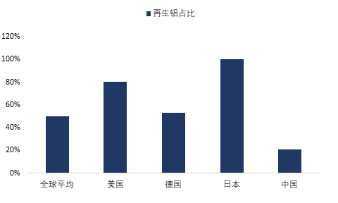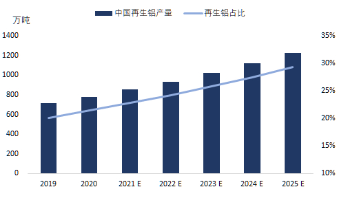 2019年全球再生铝产量3300万吨,再生铝占比达到52%,其中,中国再生铝产量为715万吨,再生铝占比仅为20%。在碳中和目标下,再生铝占比有望继续抬升。加之废旧金属释放高峰期的到来,预计到2025年中国再生铝产量占比将达到30%,今后五年国内再生铝产量年均增量约为85万吨。同时,海外再生铝占比已处于相对较高水平,再生占比继续增加的空间有限,全球再生铝增量不足以满足每年新能源汽车、建筑铝模板、太阳能及风电铝需求年增量。