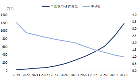 目前国内车桩比约3:1,工信部规划到2025年建成公共桩200万个,私人桩1000万个,预计到2025年车桩比应在2:1到3:1之间,到2030年车桩比会接近1:1的合理值。国际能源署IEA发布《Global EV Outlook 2019》报告提及到2030年全球私人充电桩预计保有量分别达到12800-24500万台,总充电功率达1000-1800GW,总充电量达480-820TWh。