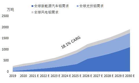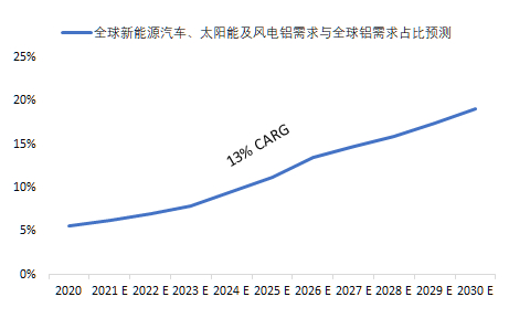 我们预计全球新能源汽车铝需求将从2020年的68万吨增加至2030年的1108万吨,全球太阳能光伏及风电铝需求将分别从2020年的184万吨和110万吨增加至2030年的636万吨及174万吨。全球新能源汽车、光伏及风电铝需求在全球原铝需求中的占比将从2020年5.7%增加至2030年的19%,年均复合增长率达13%。