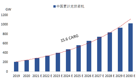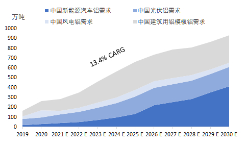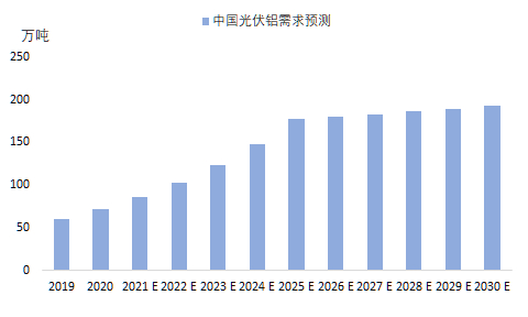 据中国有色金属工业协会统计,2019年中国光伏型材产量为110万吨,占中国铝材产量的2.5%。其中国内需求约60万吨,出口达到了50万吨左右。未来十年中国光伏装机年均复合增长率将达15.6%,我们预计中国光伏铝需求将从2020年的71万吨增加至2030年193万吨,海外光伏铝需求将从2020年的113万吨增加至2030年的444万吨。
