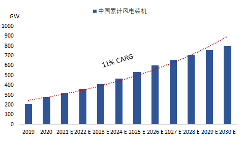 未来十年中国风电装机年均增速将达11%,2020年新增风电装机粗线爆发式增加,增加72.5GW,预计未来十年年均新增装机为52GW,并在2030年达到800GW。我国较小型风电叶片一般选用量大、价廉的玻璃纤维增强塑料,较大型叶片选用碳纤维复合材料或碳纤维或铝合金挤压成型叶片。