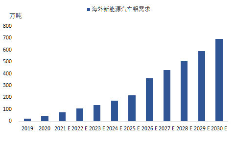 我们预计中国新能源汽车车身用铝量将从当前的28万吨达到2025年的134万吨,在2030年将达到416万吨。海外新能源汽车用铝业将呈现高速增加。全球新能源汽车用铝量将到2030年达到1100万吨,对全球铝需求的占比从2020年的1%增加到2025年的5%,并增加至2030年的约11%。