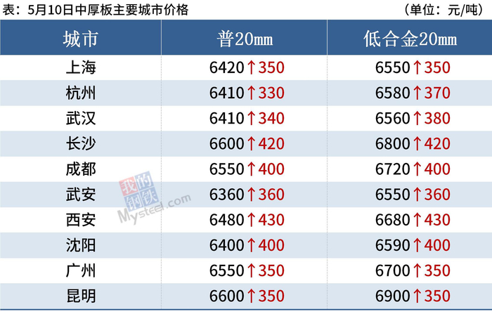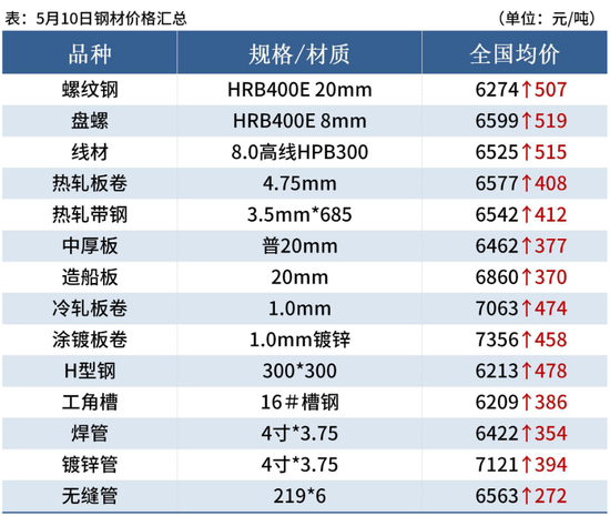中厚板:5月10日,全国24个主要城市20mm普板均价6462元/吨,较上个交易日价格上涨377元/吨。其中,上海6420元/吨,广州6550元/吨,武安6360元/吨,武汉6410元/吨,重庆6550元/吨。