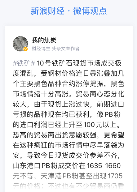今日多个品种强势涨停也引来了诸多行业大佬在微博汇内热议,其中不乏很有参考价值的独到观点及信息,以下展示部分精选后内容。