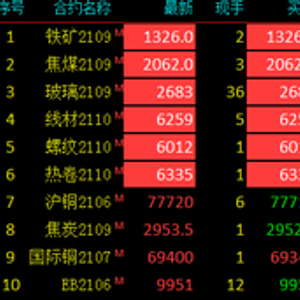 5月10日,期市收盘,盘面大面积飘红,黑色系领涨,铁矿主力合约午后封涨停,涨幅10%,焦煤主力合约涨停,收涨7.99%,玻璃主力合约午后封涨停,涨幅6.01%,螺纹、热卷主力合约封涨停,涨幅均为5.99%,沪铜、国际铜、苯乙烯(EB)、焦炭、郑煤主力合约涨超4%,乙二醇(EG)、沪铝主力合约涨超3%;跌幅方面,生猪主力合约跌6.72%,沪锡、菜籽主力合约跌超1%。