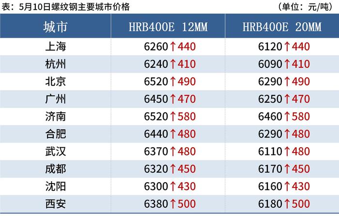 建筑钢材:5月10日,全国31个主要城市20mm三级抗震螺纹钢均价6274元/吨,较上个交易日上涨507元/吨。其中,上海市场报收6120元/吨、北京市场报收6290元/吨、广州市场报收6250元/吨。