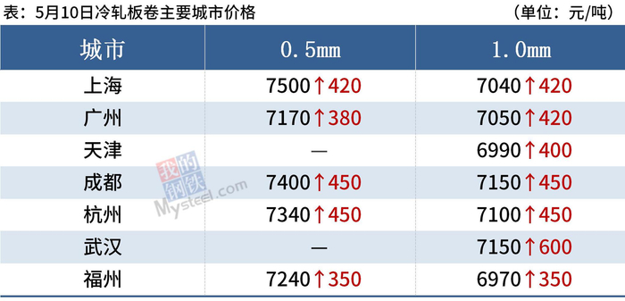 冷轧板卷:5月10日,全国24个主要城市1.0mm冷卷均价7063元/吨,较上个交易日上涨474元/吨。,其中上海价格为7040元/吨、乐从价格为7000元/吨、天津价格为6990元/吨,整体出货一般。从区域看,华东区域上调300-600元/吨,华中区域上调500-600元/吨,东北地区上调400-500元/吨,华北地区上调400-600元/吨,西南地区上调300-450元/吨,华南地区上调380-420元/吨。
