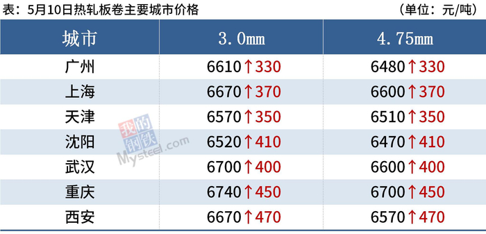 热轧板卷:5月10日,全国24个主要城市4.75mm热轧板卷均价6577元/吨,较上个交易日上涨408元/吨。10日早盘市场报价上涨,涨后市场成交较好,交投氛围活跃,午后商家价格继续拉升,尾盘出现部分封盘不出现象,各区域来看,上海报收6600元/吨,乐从报收6480元/吨,天津报收6510元/吨,区域价差呈现倒挂,华南价格成为洼地。