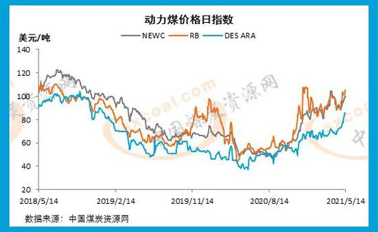 数据显示,截至2021年5月14日当周,纽卡斯尔港动力煤价格再次来到100美元/吨上方,南非理查兹湾港动力煤价格同样较前一周大涨,超105美元/吨,而欧洲ARA三港动力煤价格也升至2018年12月末以来新高。