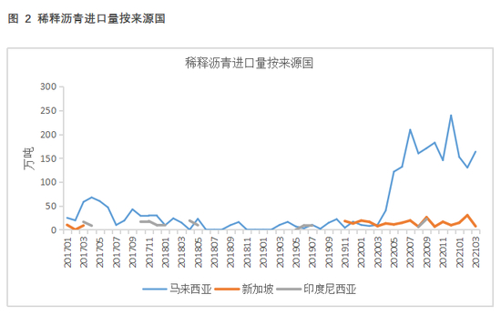目前我国稀释沥青进口来源国以马来西亚为主。2020年4月起稀释沥青进口量再次出现了增长,据彭博,这时的稀释沥青指标与委内瑞拉Merey原油相似,委内瑞拉原油可能在马来西亚周围的海域通过Ship to Ship方式过驳,再以马来西亚稀释沥青的名义进口到中国。