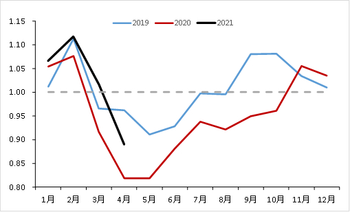 第一,我们先根据前期宁夏的能源消费总量双控文件进行分析。4月16日,宁夏《2021年度能源消费总量和强度双控目标任务及重点工作安排》要求,全区单位GDP能耗同比下降3.3%,能耗增量控制在260万吨标准煤。根据文件设置的能源消耗标准,我们推算中卫、石嘴山等核心硅铁、锰硅产区压缩理论值硅铁产量为1.40万吨/月,锰硅为3.84万吨/月。占21年1-4月宁夏硅铁月均产量10.07万吨的13.90%,或全国月均产量51.56万吨的2.72%,占宁夏锰硅月均产量20.13万吨的19.08%,或全国月均产量88.39万吨的4.34%。