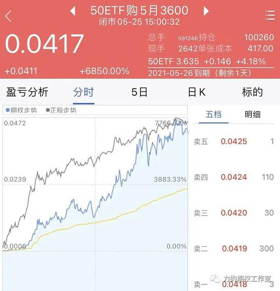 今天是上证50ETF五月期权到期倒数第二天,在全天的四小时里,最近已经有所异动的券商、白酒再次共振发力,50指数当日大涨4%以上,这也使得C3600@5合约爆发了“大逆转的Gamma威力”,从虚1档直接越过了平值,期间最高的涨幅一度逼近了78倍。回顾这个月初写的《五月防变盘,需要“小舍得”!》,真不得不感叹,低波下的变盘威力是真的大!