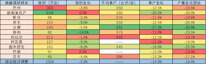 产量总结:根据面积和单产降幅推算,2021年南疆棉花产量可能有19.4%的下降。减产是确定的,具体减多少还要看天气。