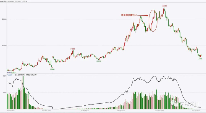然而,多头却神奇的减仓了,盘面开始大幅反转,直线下跌。后来听闻是交易所把多头给劝退了,目的是为了保护产业,避免产业非标套利资金给拉爆,所以监管的态度本身就是保护产业,不保护投机的,而产业本身又是大举做空的,在这种情况下,这个品种做多太难了,所以从监管角度来讲,它也是一个空配的品种。