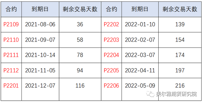 棕榈油期权交易时间和标的期货一样,周一至周五的上午9:00-11:30,下午13:30-15:00以及晚上21:00-23:00。首批上市的棕榈油期权合约系列有10个,最近的P2109期权系列应为主力合约,各合约到期时间如下: