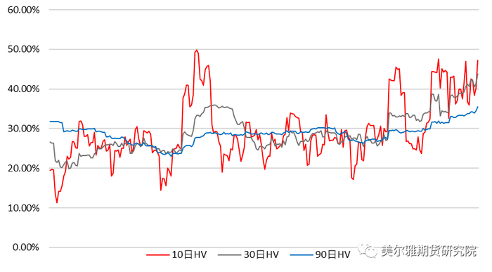 历史波动率代表的是价格涨跌幅度的剧烈程度,因此在期货价格处于单边趋势行情中,尤其是快速大涨大跌时,历史波动率会明显升高。上图可以很明显看出,19年棕榈油先上涨2000点,同时历史波动率从10%升至25%,之后棕榈油再下跌2000点,历史波动率再度上升至35%以上。近一年时间内,棕榈油价格持续上行,而历史波动率在25%~35%区间变化,有明显的均值回复特性。近期受外盘影响,棕榈油大幅下跌,波动率向上攀升至45%的高位。